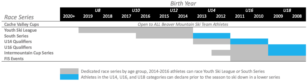 Athletes have different series they race in depending on their birth year. Please see the matrix below to identify the correct series for your child. ALL Beaver Mountain Ski Team athletes, regardless of age or competitive level, are encouraged to race the Cache Valley Cups!